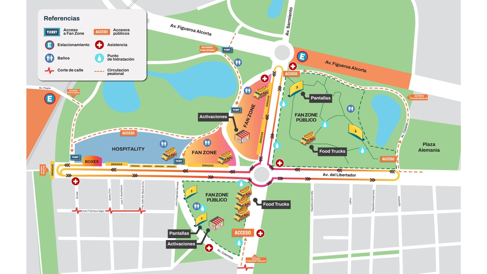Para asegurar que nadie se pierda detalle, se instalarán pantallas en distintos puntos clave del circuito, incluyendo intersecciones como Libertador y Casares, Libertador y Cavia, y la zona del Planetario Galileo Galilei, entre otras ubicaciones estratégicas a lo largo del recorrido.