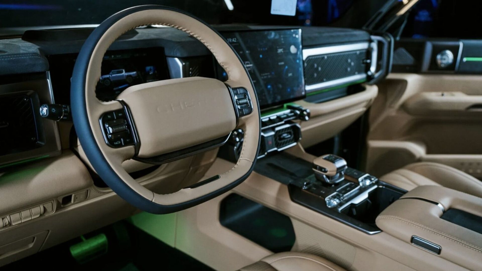 La consola central también refuerza este enfoque dual: incluye una palanca de cambios de gran tamaño y comandos específicos para funciones off-road, como los bloqueos de diferencial y los modos de conducción. A esto se suman controles físicos para los asientos calefaccionados y ventilados, un equipamiento poco habitual en este tipo de vehículos.