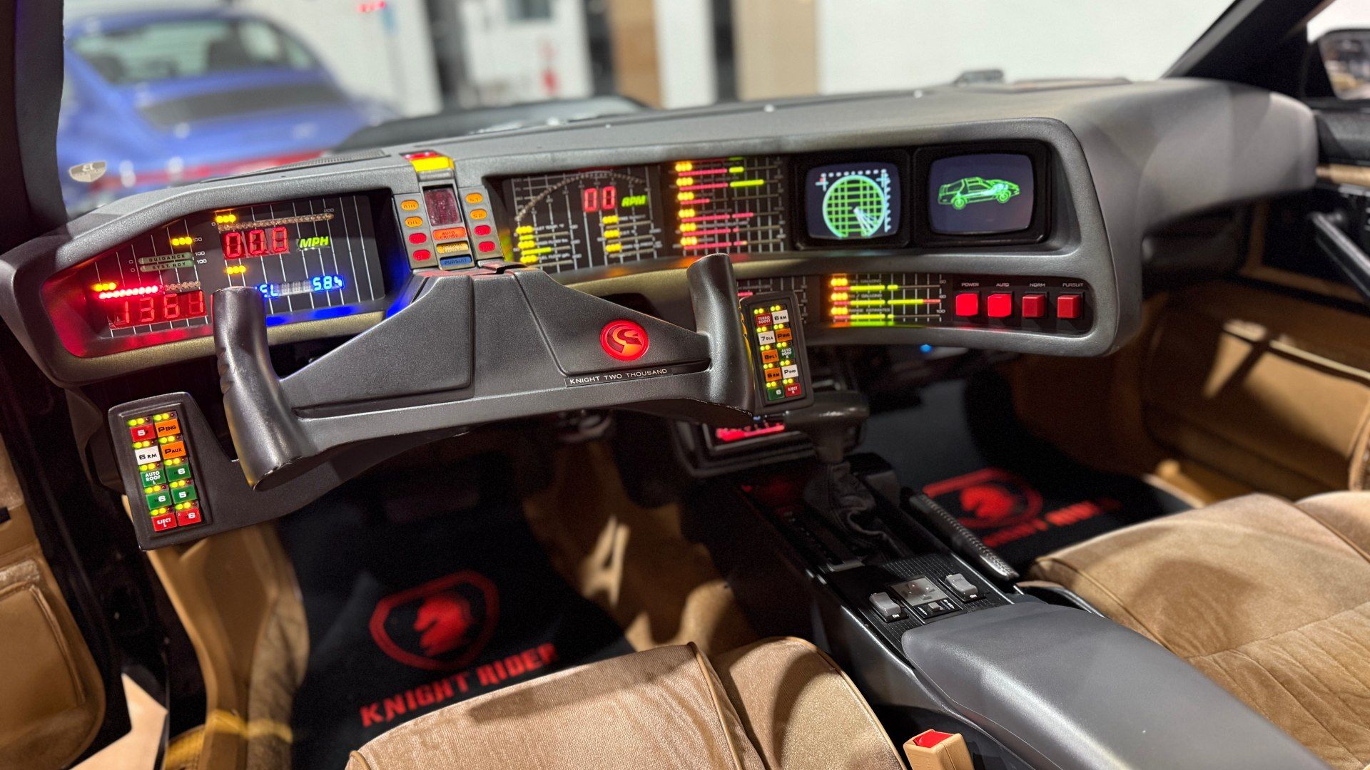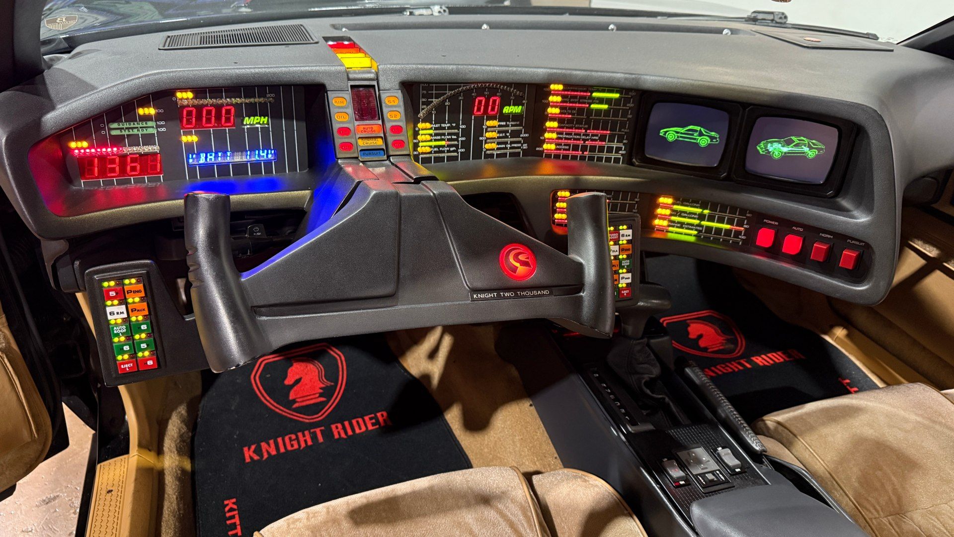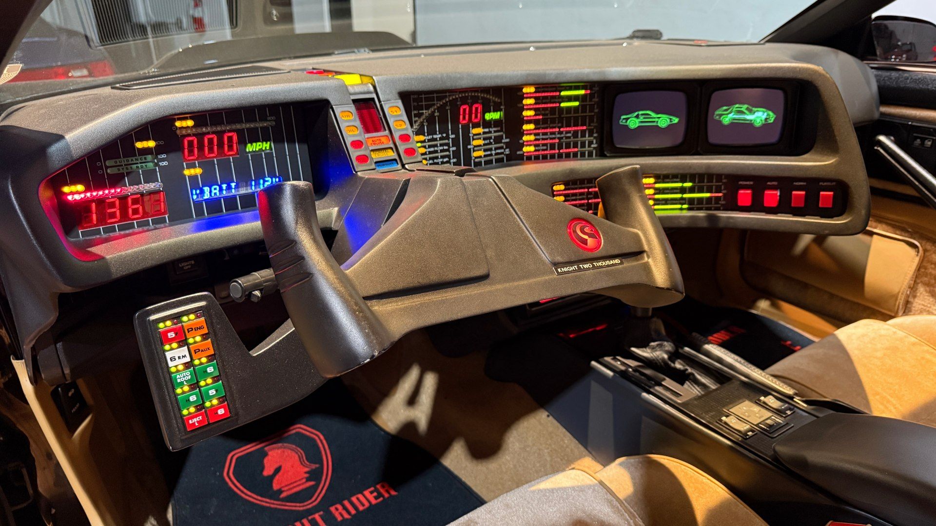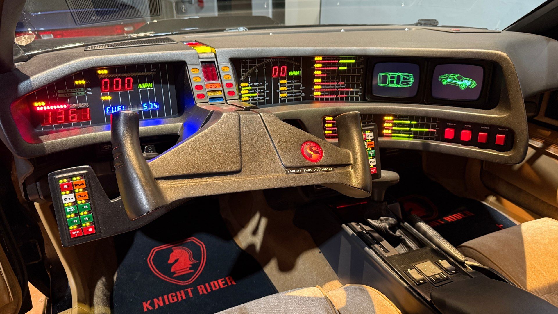 Conducir un Knight Rider trae todo ese imaginario a la superficie. Apenas abrís la puerta, el tablero te envuelve con esa estética desbordada, llena de luces, botones físicos para cada función y pantallas que parecieran estar guardando secretos. La barra roja del frente que representa el “escáner” del modo vigilancia y las barras verticales en el tablero justo frente al conductor, simbolizaban la inteligencia de KITT, no son solo un adorno, son un latido visual que te prepara para la ficción.