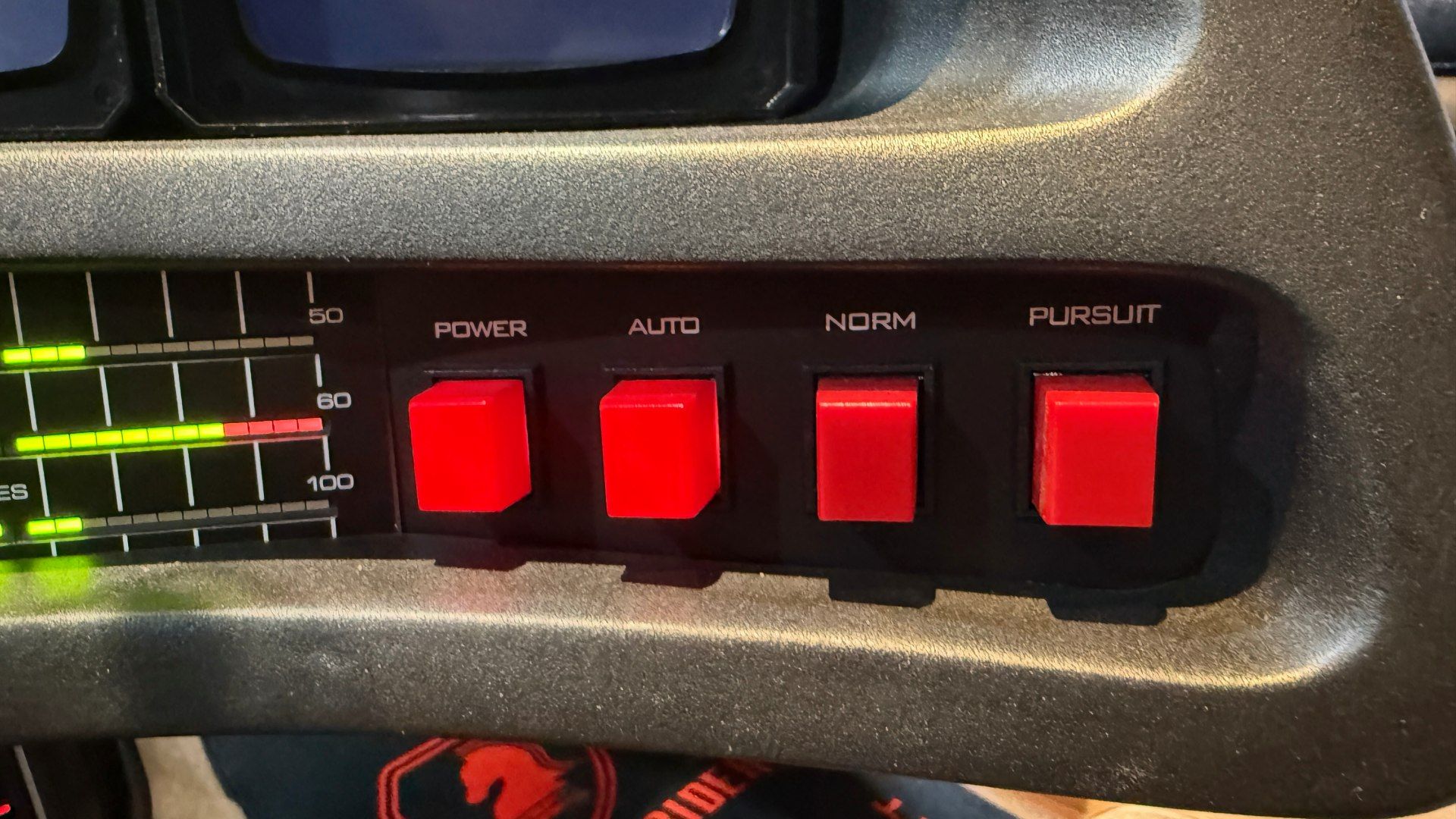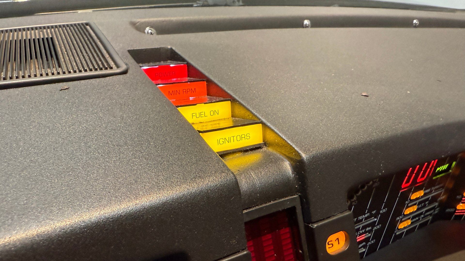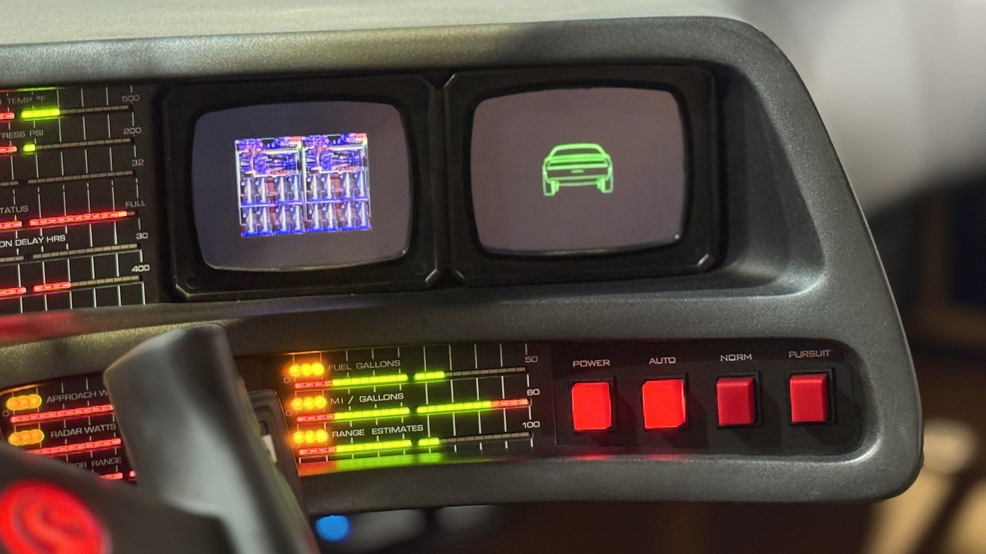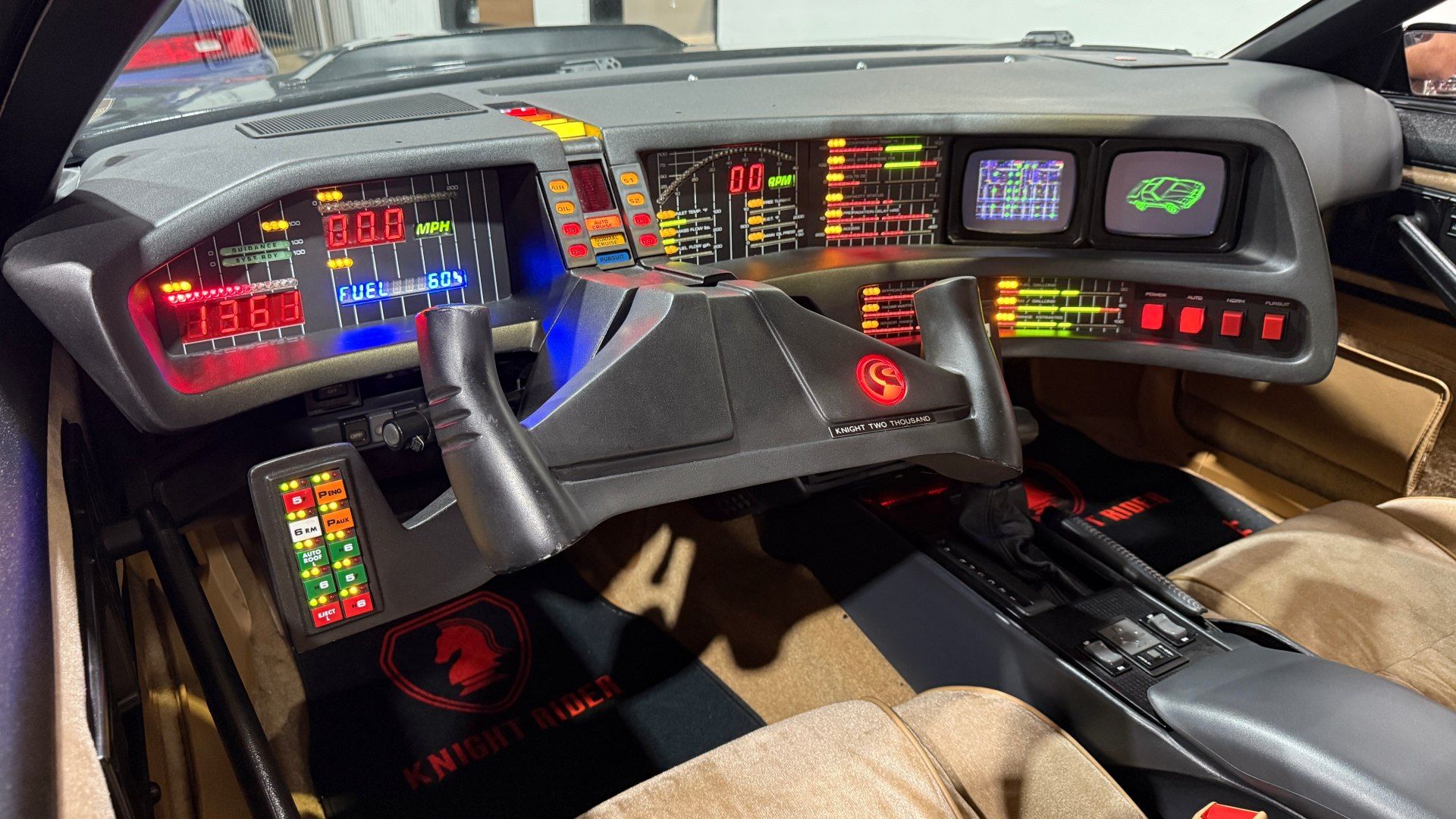 Conducir un Knight Rider trae todo ese imaginario a la superficie. Apenas abrís la puerta, el tablero te envuelve con esa estética desbordada, llena de luces, botones físicos para cada función y pantallas que parecieran estar guardando secretos. La barra roja del frente que representa el “escáner” del modo vigilancia y las barras verticales en el tablero justo frente al conductor, simbolizaban la inteligencia de KITT, no son solo un adorno, son un latido visual que te prepara para la ficción.