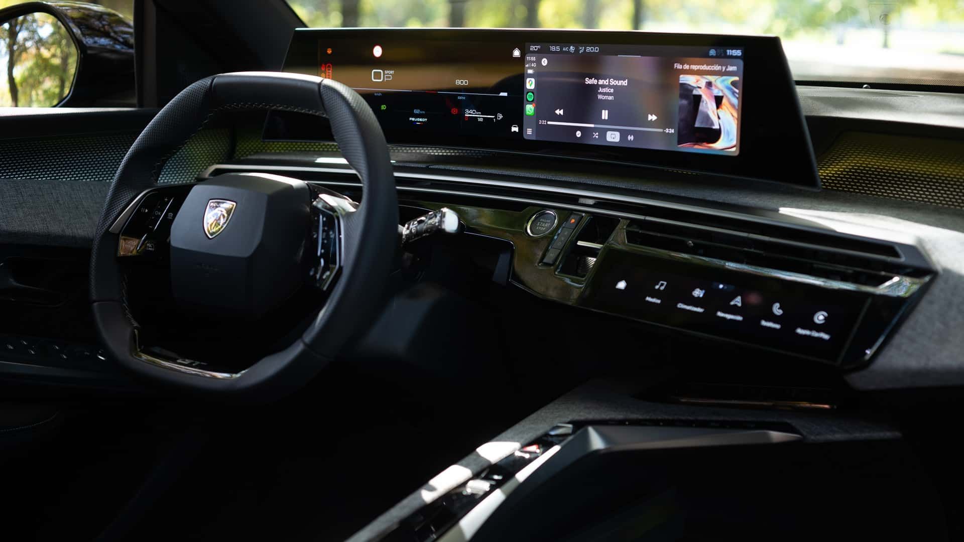 En el interior, la gran novedad es el Peugeot Panoramic i-Cockpit, con una pantalla curva de 21 pulgadas en alta definición que integra cuadro de instrumentos y display central. El diseño flotante se completa con iluminación ambiental LED y los mandos i-Toggles, accesos directos personalizables. El volante compacto fue rediseñado con mandos táctiles sensibles al contacto, calefacción y mayor ergonomía.