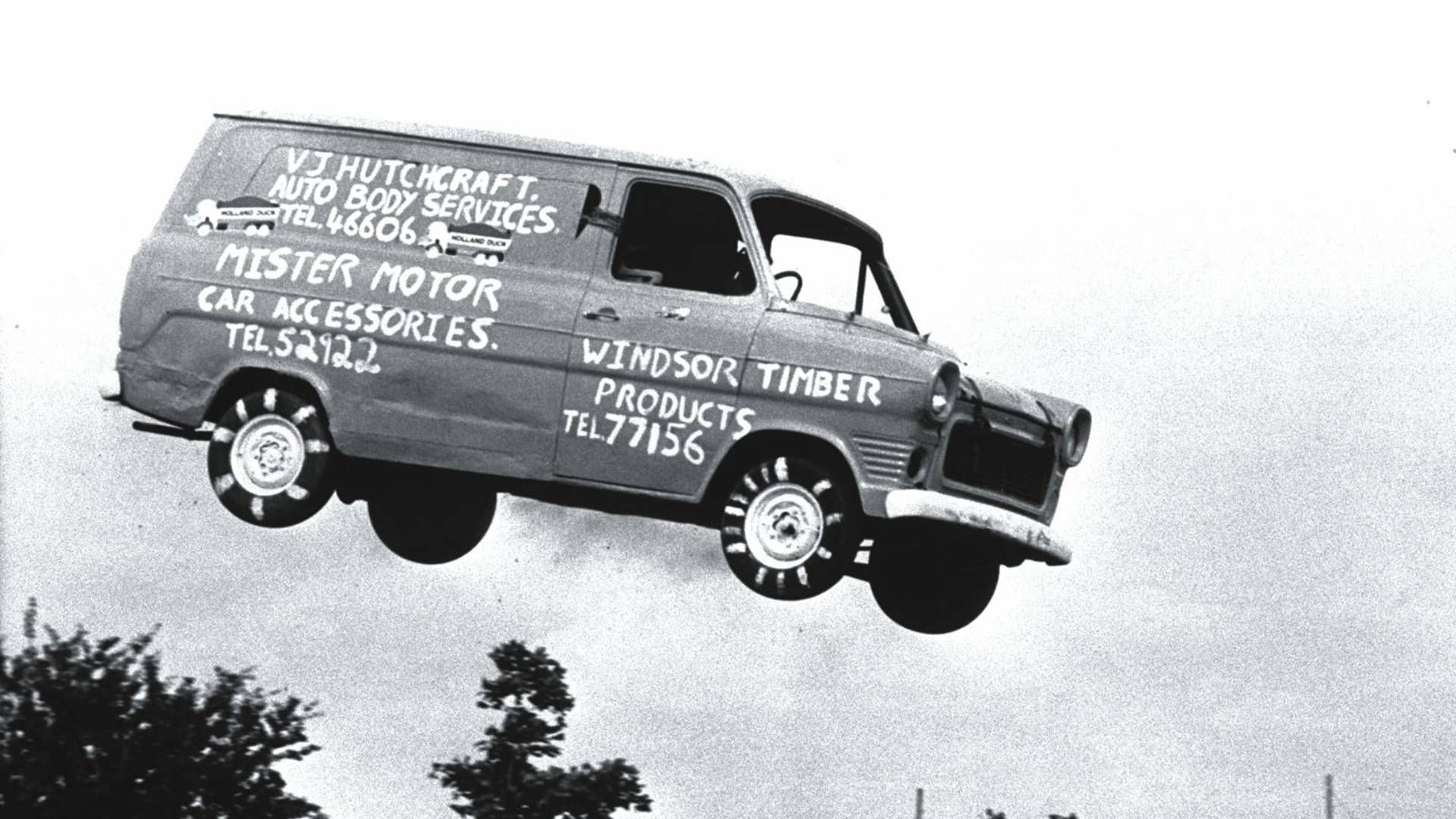 La creatividad también llevó a esta van a escenarios poco convencionales. En 1985, una Transit flotante compitió en una carrera de balsas y otra voló por encima de 15 vehículos para recaudar fondos.