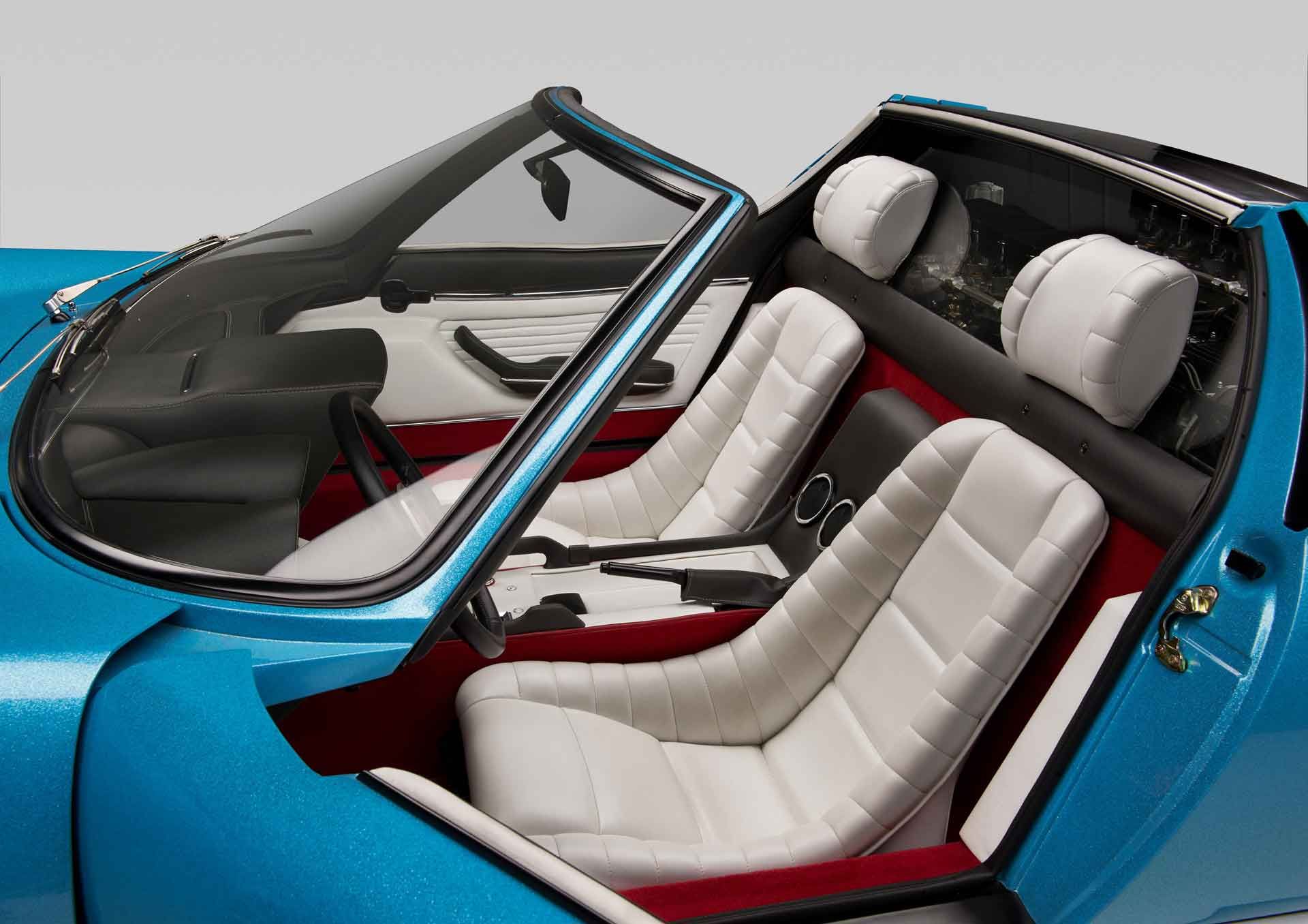 El habitáculo, elegante y deportivo, se destaca por el diseño del instrumental, en el que aparecen el velocímetro y el tacómetro como si fueran binoculares, con las pequeñas palancas de control secundarias situadas en la primera fila, en la parte superior, sobre el techo.