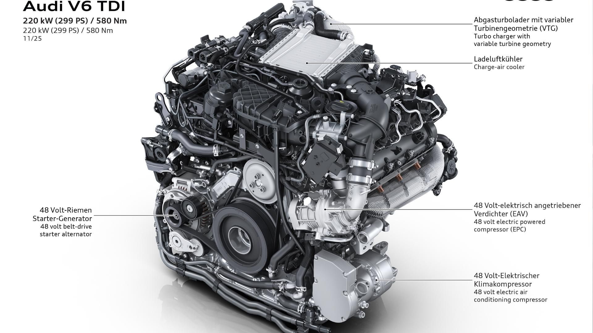 Audi anunció la incorporación de un motor diésel V6 de tres litros para sus modelos Q5 y A6, entregando 299 CV y 59,1 kgm de torque. Esta nueva motorización diésel V6 TDI quattro ya se encuentra disponible para ambos modelos, y se destaca por la aplicación, por primera vez, de la tecnología MHEV plus junto a un compresor eléctrico.