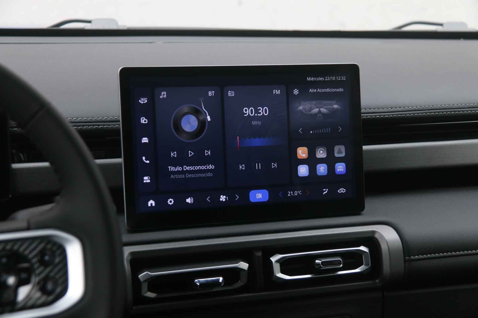 La pantalla táctil es de 10,1”, compatible con Android Auto y Apple CarPlay (por cable), y recibe las imágenes de la cámara de marcha atrás y de la representación digital, además de ser el centro de mando desde el cual se controlan todas las funciones incluyendo, entre otras, las ADAS (sólo le falta alerta de ángulo ciego), climatizador (sin salidas traseras), equipo de audio (de buena calidad) y los modos de conducción que permiten elegir los niveles de regeneración de energía y hasta la sensación de frenado.