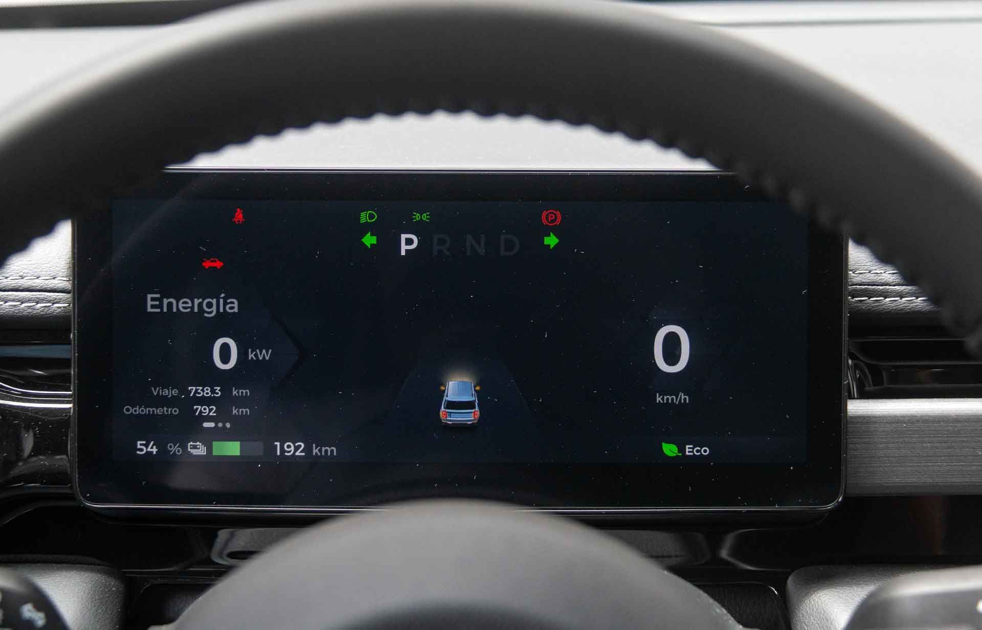 El tablero es ciento por ciento digital y, además de la información habitual, ofrece datos específicos del motor tales como el porcentaje de entrega de energía, los niveles de voltaje e intensidad, y las revoluciones por minuto del motor, un detalle que hasta ahora no había visto en otro automóvil eléctrico.