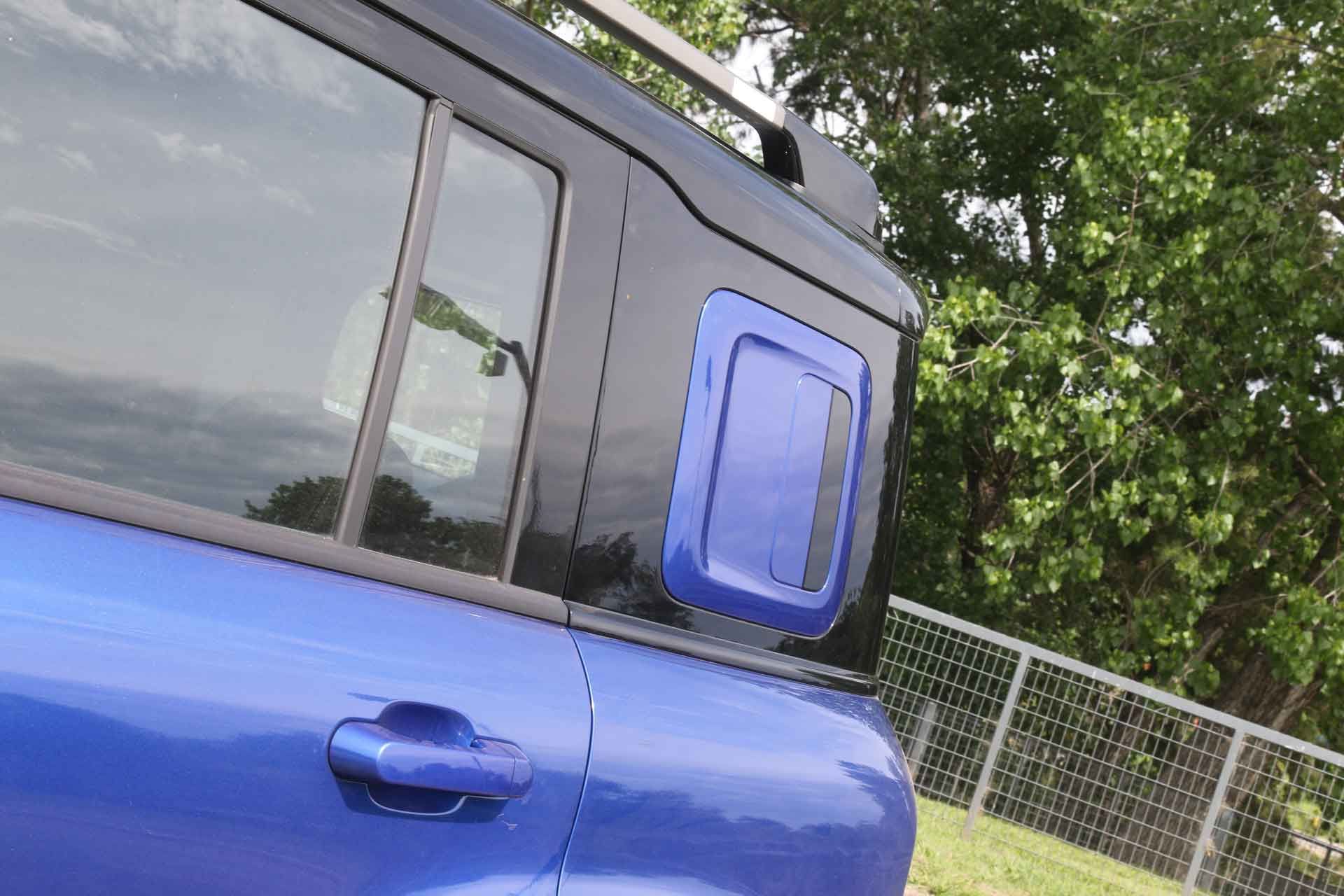 Agrega como detalle personal una “falsa ventanilla” de plástico en los parantes C, cuya finalidad es meramente estética. No obstante, la zona vidriada (parabrisas, ventanillas y luneta) es amplia. También el diseño de la llave aparece como un detalle de estilo.